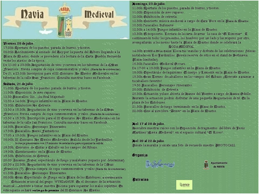 PROGRAMACIÓN Publicado pornaviamedieval17 de abril de 202319 de julio de 2023Publicado en Sin categoría PROGRAMACIÓN NAVIA MEDIEVAL 2023Descarga PROGRAMACIÓN DE EDICIONES ANTERIORES Comparte esto: Compartir en X (Se abre en una ventana nueva) X Comparte en Facebook (Se abre en una ventana nueva) Facebook Me gusta Cargando... Relacionado